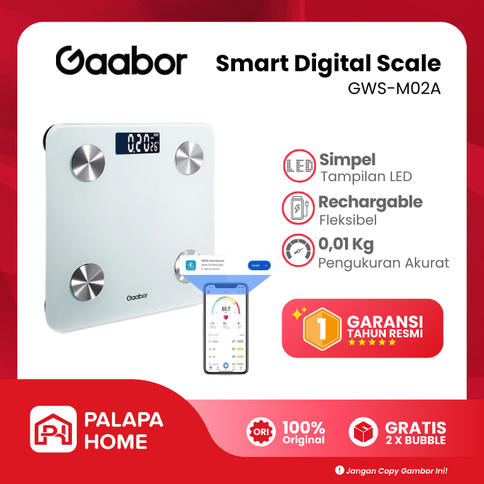 Gaabor Smart Digital Fat Scale GWS-M02A adalah timbangan komposisi tubuh pintar yang dirancang untuk membantu Anda memantau kesehatan secara holistik. Timbangan digital ini tidak hanya mengukur berat badan (hingga ) tetapi juga dilengkapi fitur untuk menganalisis lemak tubuh dan berbagai komposisi tubuh lainnya, memberikan data kesehatan yang lebih lengkap. Dengan koneksi Bluetooth, semua data dapat dilihat dan direkam melalui aplikasi OKOK International di perangkat iOS atau Android, bahkan dapat merekam data hingga anggota keluarga. Timbangan ini memiliki permukaan kaca tempered yang dan , serta dilengkapi yang menampilkan angka dengan dan , menjadikannya alat penting yang modern untuk manajemen kesehatan pribadi dan keluarga.