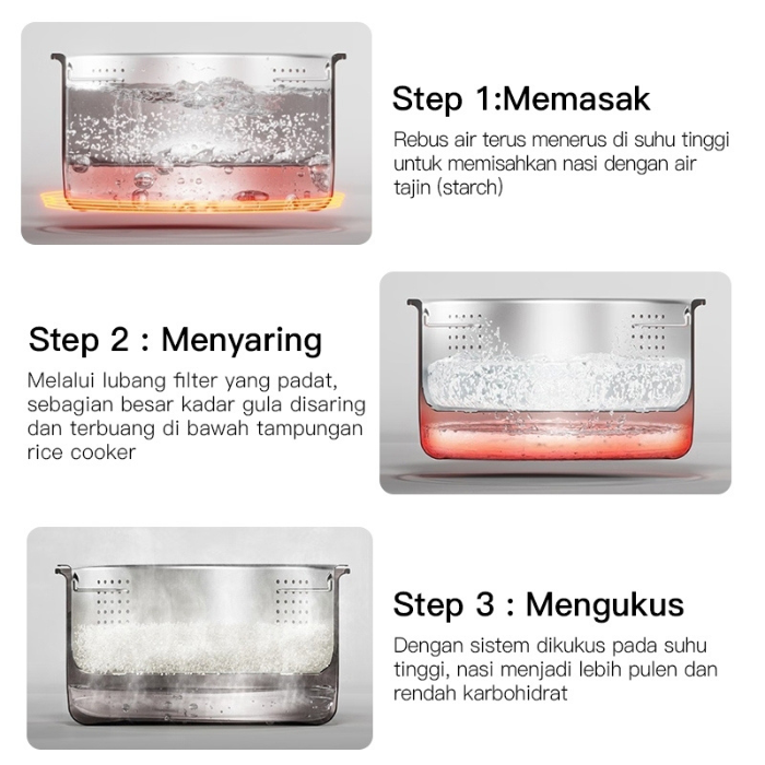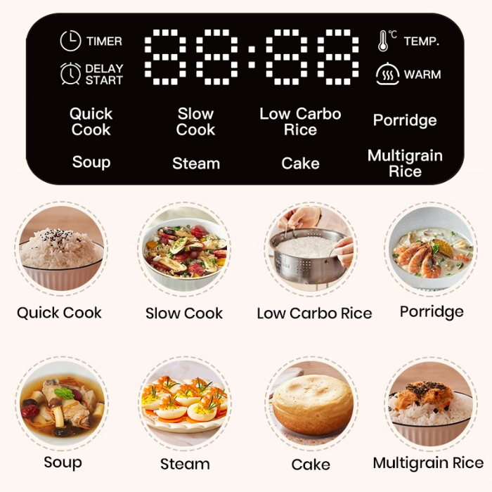 – Normal, slow cook, quick cook, soup, bubur, nasi low carbo, nasi multigrain, cake