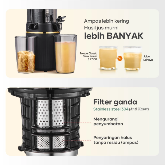 Mito SJ7100 Slow Juicer Fresca Classic adalah solusi praktis untuk gaya hidup sehat. Dengan teknologi slow juicing yang inovatif, alat ini mengekstrak sari buah dan sayuran secara perlahan, memastikan nutrisi, vitamin, dan enzim tetap terjaga dengan baik. Dilengkapi dengan motor berdaya rendah, juicer ini bekerja dengan suara yang minim sehingga tidak mengganggu. Desainnya yang elegan dan ringkas memudahkan penyimpanan dan cocok diletakkan di dapur modern mana pun. Dibuat dari material berkualitas tinggi yang aman untuk makanan, Mito SJ7100 tidak hanya menghasilkan jus yang lebih sehat dan lezat, tetapi juga mudah dibersihkan, menjadikannya pilihan ideal bagi siapa pun yang ingin menikmati jus segar setiap hari tanpa repot.